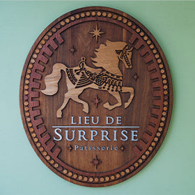 ロゴマークは、「驚き」の文字の中にある「馬」をモチーフにしています。頭が右にあり、しっぽが左にある馬の絵は「左馬」という縁起のよい福馬で、LIEU DE SURPRISEと訪れるお客様を温かく見守っています。
